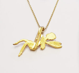 Πανέμορφο μενταγιόν που απεικονίζει έναν άγγελο να κάνει κούνια δημιουργημένο από επιχρυσωμένο ασήμι 925o . Συνοδεύεται από αλυσίδα από ασήμι 925 επίσης επιχρυσωμένη.
